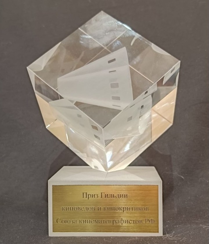Прекрасную награду — монолитный куб и стекла с уникальной 3D гравировкой символа Гильдии — рупор , свернутый из кинопленки, изготовила для нас научно-производственная компания «ОПТЕКС».