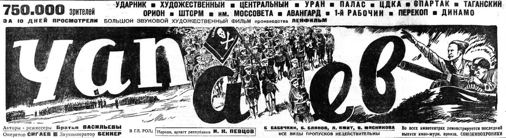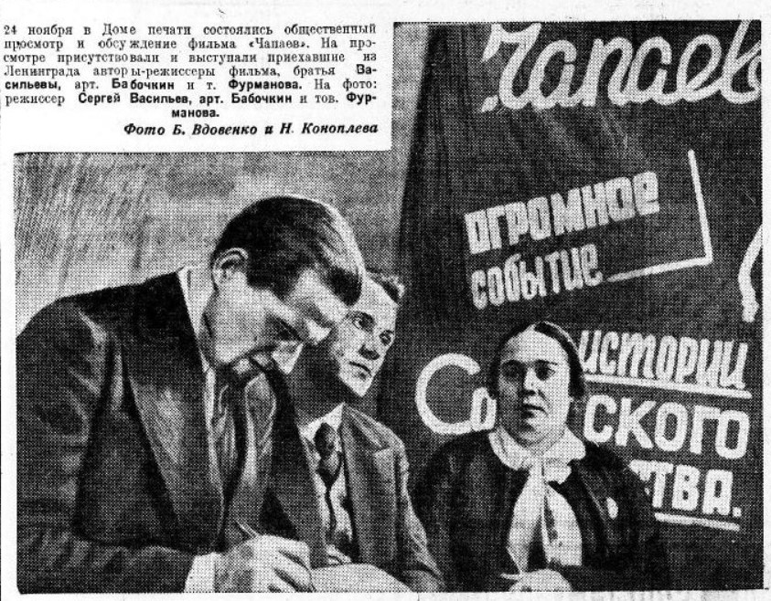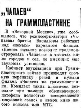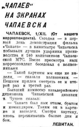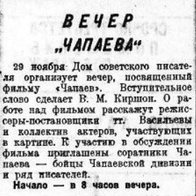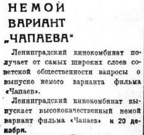 - «Вечерняя Москва», 01.12.1934 стр. 3. Чапаевцы о «Чапаеве» и Немой вариант «Чапаева»