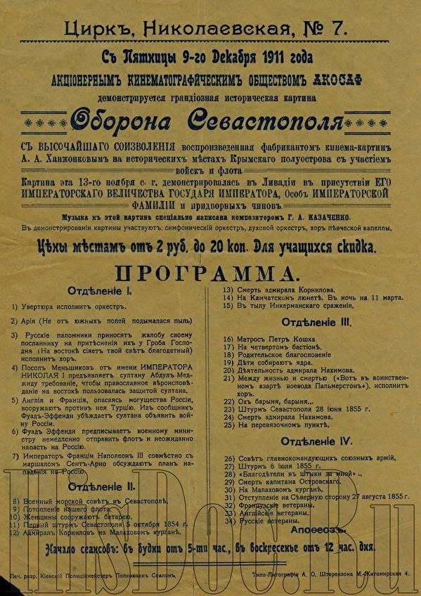 Россия, А. Ханжонков и К, 1911, ч/б, 100 мин. (2000м), 35 мм, 1.33:1, 18 к/с, немой.