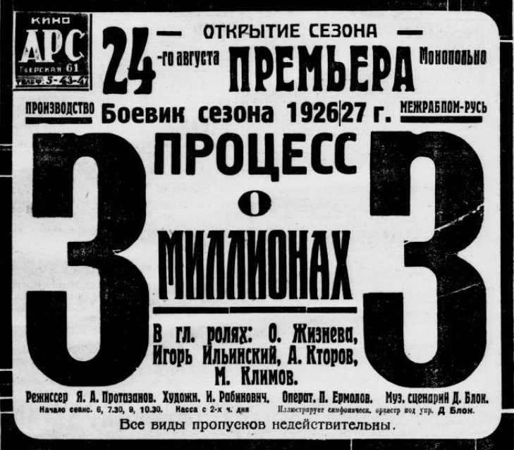Премьера в кинотеатре «АРС» 24 августа 1926 года.