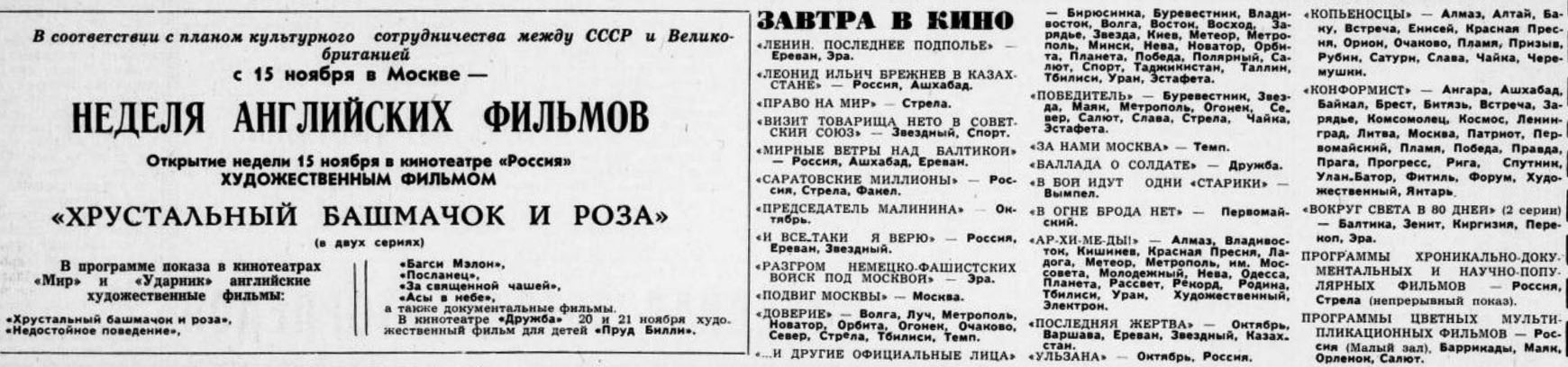 - КОРОЛЬ В НЬЮ-ЙОРКЕ (A King in New York) (Великобритания — США, 12.09.1957) — Алмаз. Казахстан. Комсомолец, Марс, им. Моссовета, Нева, Очаково. Полярный, Призыв, Родина. Слава. Стрела. Таджикистан, Таллии, Темп. Факел. Форум. Эстафета.